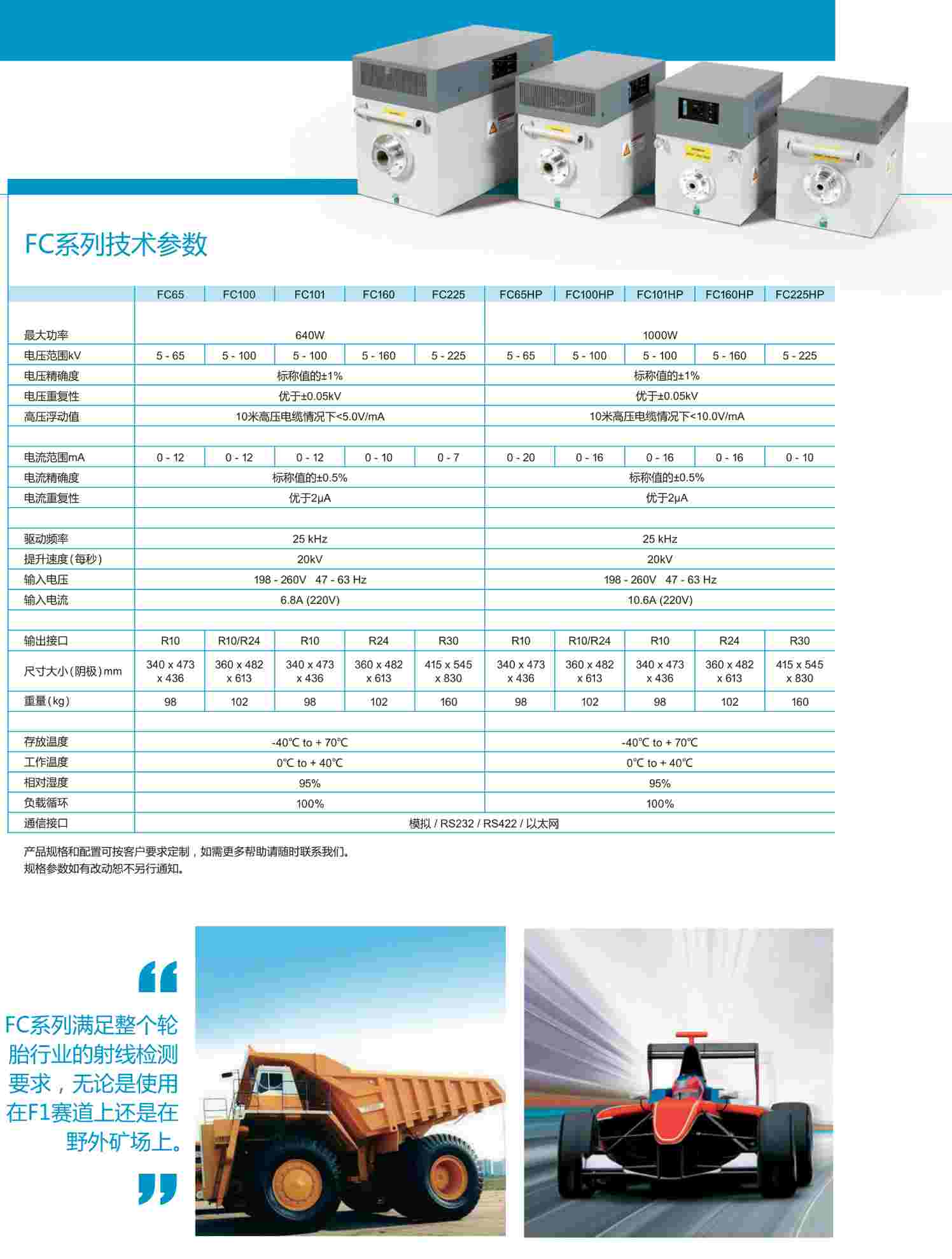 當使用傳統(tǒng)的和高功率的X射線管時,F(xiàn)C系列射線機是理想的高壓供給系統(tǒng)??蓱迷诟鞣NX射線影像技術。包括二極管線陣列成像、數(shù)字平板成像和動態(tài)平板成像。FC系列產(chǎn)品被廣泛的應用在輪胎檢測行業(yè),同時也應用在食品檢測、安保檢測等一系列NDT檢測。