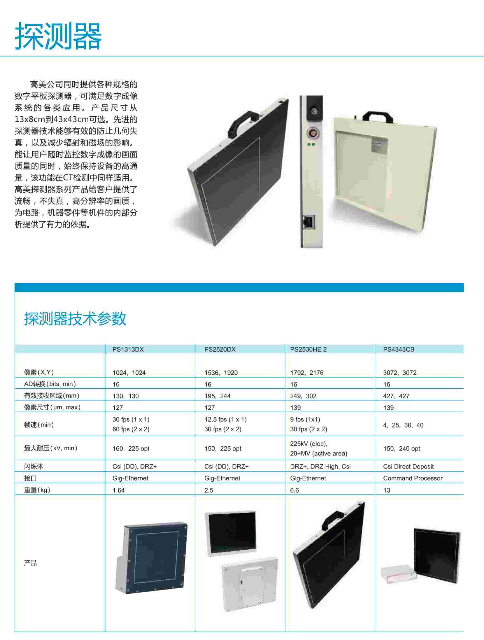 高美公司同時(shí)提供各種規(guī)格的數(shù)字平板探測(cè)器,可滿(mǎn)足數(shù)字成像系統(tǒng)的各類(lèi)應(yīng)用。產(chǎn)品尺寸從13×8cm到43×43cm可選。先進(jìn)的探測(cè)器技術(shù)能夠有效的防止幾何失真,以及減少輻射和磁場(chǎng)的影響。