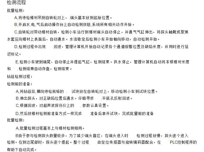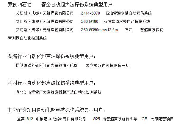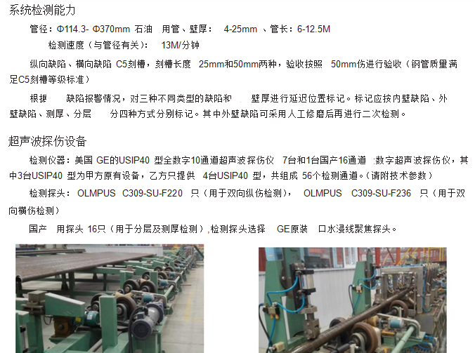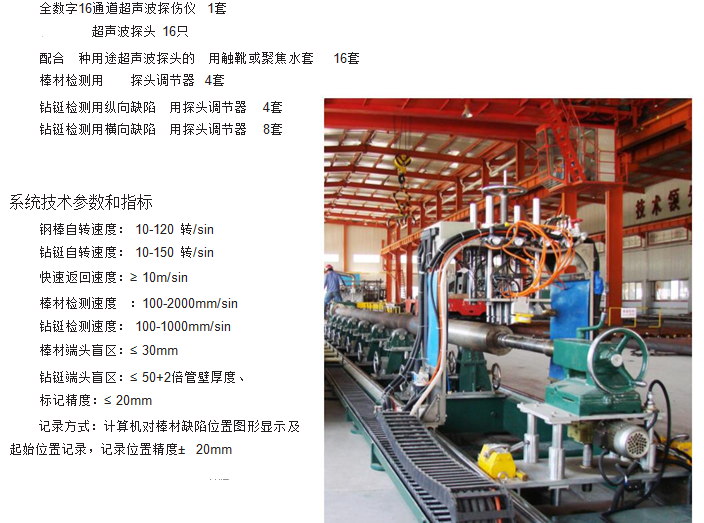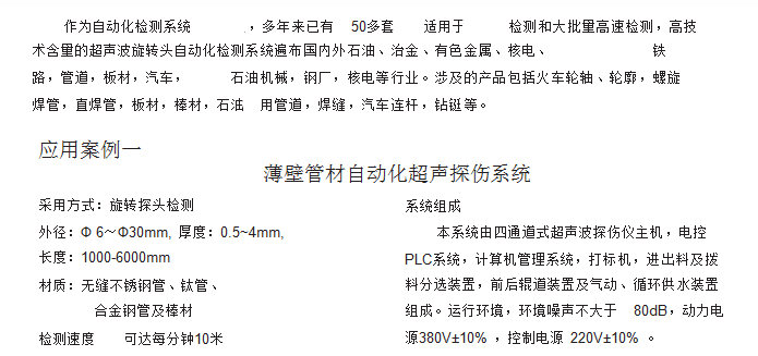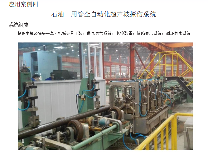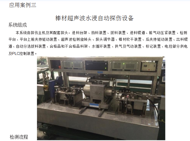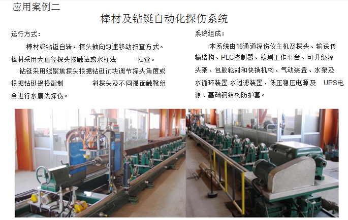 工作方式:工件旋轉(zhuǎn)式前進(jìn),探頭固定探頭位于水槽內(nèi),探傷時(shí)水禮升起,工件下方侵入水槽探頭與彼測(cè)管泊通過循環(huán)水的耦合方式掃查探傷。比較適合石油管道。