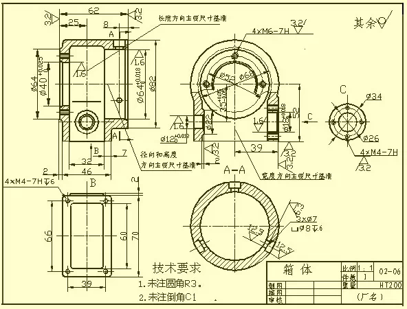 一 般來說,這類零件的形狀、結構比前面三類零件復雜,而且加工位置的變化更多。這類零件一般有閥體、泵體、減速器箱體等零件。在選擇主視圖時,主要考慮工作 位置和形狀特征。選用其它視圖時,應根據實際情況采用適當的剖視、斷面、局部視圖和斜視圖等多種輔助視圖,以清晰地表達零件的內外結構。