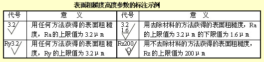 表面粗糙度高度參數Ra、Rz、Ry在代號中用數值標注時,除參數代號Ra可省略外,其余在參數值前需標注出相應的參數代號Rz或Ry,標注示例