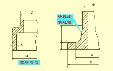 當鑄件的壁厚不均勻時,鑄件在澆鑄后,因金屬冷卻速度不同,將產生裂紋和縮孔現象。因此,鑄件的壁厚應盡量均勻,見上圖;當采用不同壁厚連接時,應采用逐漸過渡的方式,見上圖。鑄件的壁厚尺寸一般采用直接注出。