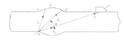 如圖4 所示, 當(dāng)超聲波主聲速方向與焊角處輪廓法線方向之夾角α小于第三臨界角αⅢ時(shí), 界面處除反射1 個(gè)橫波S2 外, 還會(huì)產(chǎn)生1 個(gè)變型縱波L。當(dāng)α遠(yuǎn)小于αⅢ時(shí), 變型縱波L 會(huì)射至c、b 等處, 相應(yīng)地, 反射橫波S2 會(huì)射至c、d 等處, 這些地方的輪廓法線方向與聲波入射方向相同或相近, 因此會(huì)在示波屏上產(chǎn)生2 個(gè)反射回波, 即L 與S2。另外, 由于α較小, 入射聲速S 的一部分會(huì)直接由焊角處返回探頭, 形成焊角回波S1。這樣, S1、S2 與L 波形成1 個(gè)如漢字“山”形的回波群, 故稱(chēng)“山形回波”。