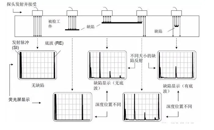 反射法利用的是超聲波的反射特性,即超聲波在由一種介種介質(zhì)的過程中,在兩介質(zhì)的交界面處會(huì)發(fā)生反射,且介質(zhì)間差別越大反射程度也會(huì)越大?;谶@種原理,在對物體缺陷進(jìn)行檢測時(shí),可以先對物體發(fā)射超聲波,然后對反射回來的超聲波進(jìn)行接收,通過對比所發(fā)射的與接受到的超聲波的異同即可判定物體的內(nèi)部結(jié)構(gòu),其是否含有缺陷,缺陷屬于哪種類型,處于什么位置等等。